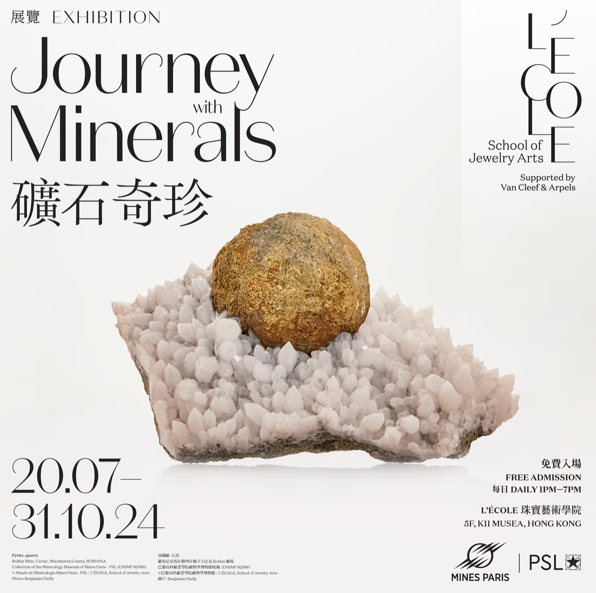 L'ÉCOLE珠寶藝術學院亞太區分校與巴黎高科礦業學院礦物學博物館(Mineralogy Museum of Mines Paris – PSL)合辦「礦石奇珍」展覽,作為L’ÉCOLE珠寶藝術學院亞太區分校舉辦的第八場專題展覽,展覽將陳列約40件展品,並劃分成五個策展主題,包括「物質」、「珠寶」、「科技」、「藝術」和「太空」,以珍稀的礦石掀開其在人類歷史及文明中扮演的角色的帷幔。