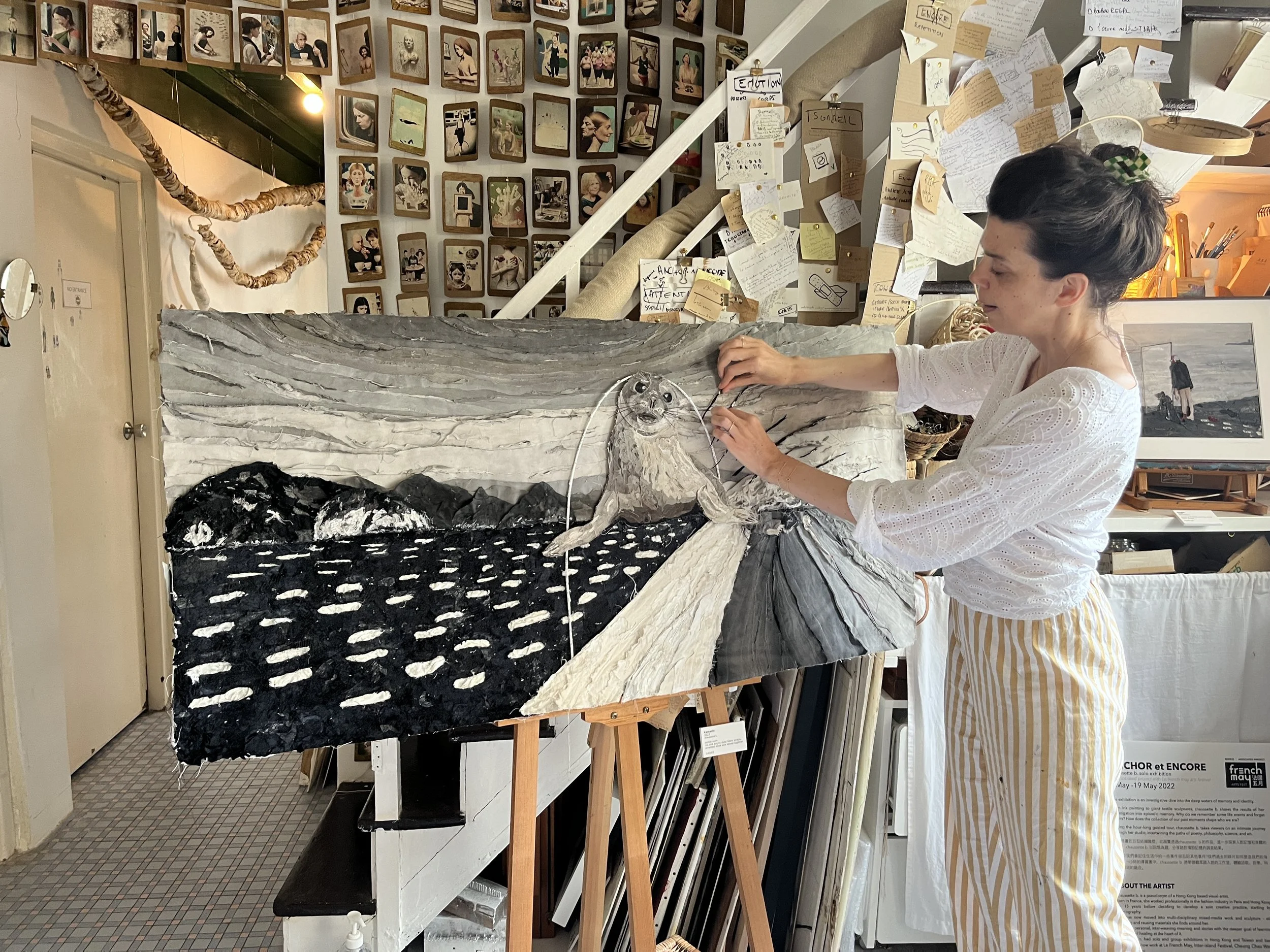 在長洲隱密的角落裡,時間似乎暫停了匆忙的步伐,在五月平日的一個下午,筆者前往駐港法籍藝術家 chaussette b. 的工作室。這已是筆者第二次到訪她的工作室,同樣作為法國五月藝術節的焦點項目之一,chaussette b.最新的沉浸式藝術展覽「Anchor et encore」以她獨特的創作方式,以畫作和巨型紡織雕塑,傳達她對記憶和身體意識的探索。她以回憶為主題,向觀眾分享她對情節記憶的深入研究。我們如何選擇記住某些生活事件,而遺忘其他事件呢?那些過去的碎片如何在無形中塑造了我們的身份?chaussette b.不懈地尋求解開自己記憶中神秘的深度,與chaussette b.深入探索迷宮般的記憶走廊之旅就此展開。