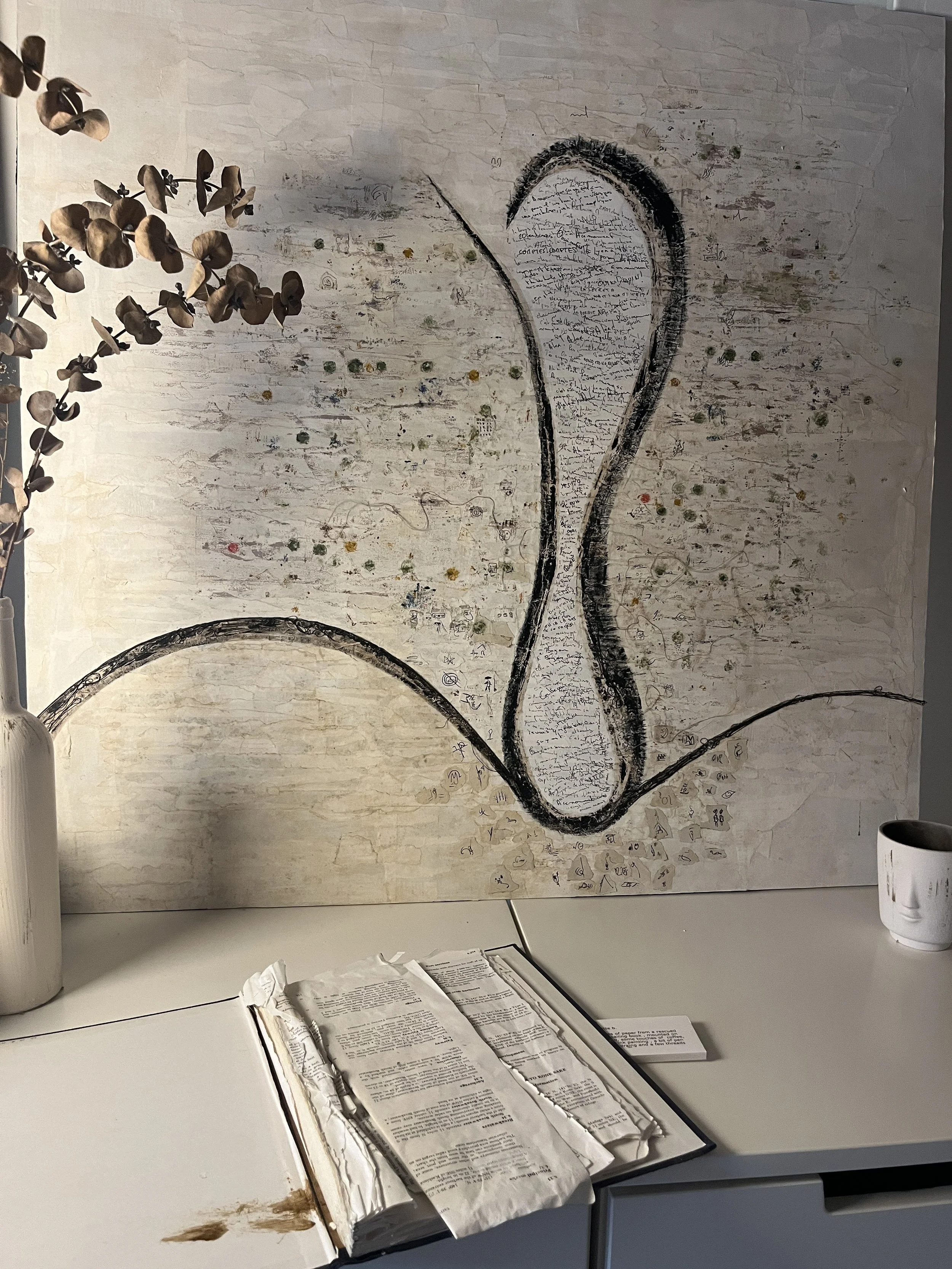 繼續展覽旅程,另一件藝術品向觀者招手——深刻反映了 chaussette b. 與外部世界無休無止的喋喋不休的抗衡。 這項佈滿法語及詩句的畫作,讓筆者思考語言的力量,筆者從小便懂說懂聽方言,所學過的語音根深蒂固在的腦海, 正如我們永遠無法真正擺脫所學的語言一樣,我們的記憶和自我認同與塑造我們的語言,錯綜複雜地交織在一起。 藝術家的揭示引發了深刻的反省,促使觀者思考記憶與自我本質之間錯綜複雜的關係。